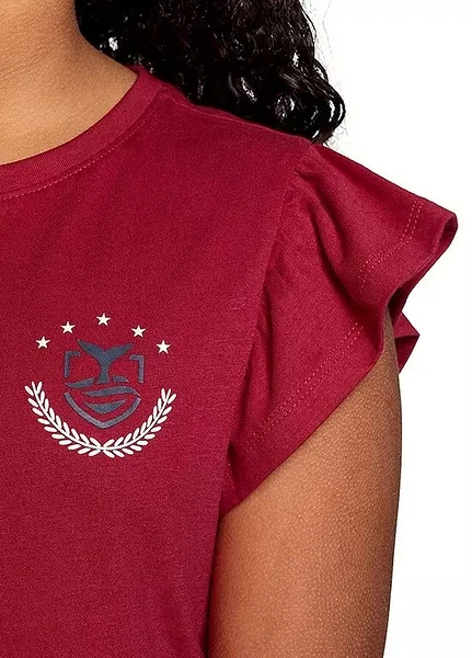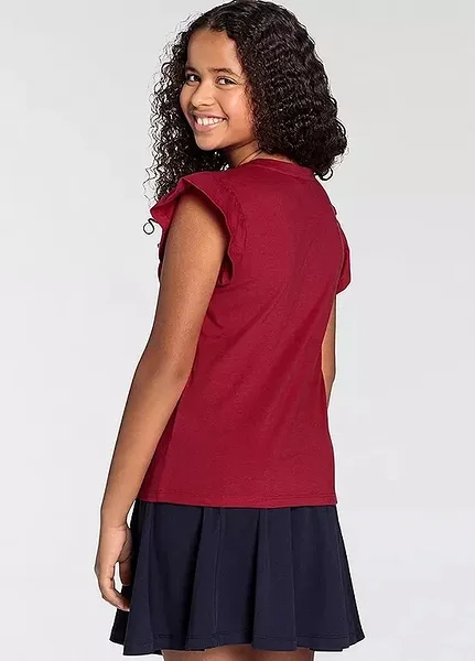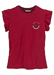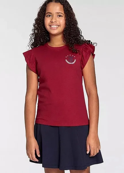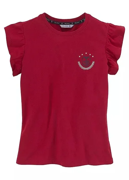 Tumepunane tüdrukute T-särk romantiliste volangvarrukatega. Pehme ja mugav puuvillane materjal sobib igapäevaseks kandmiseks nii kooli kui vaba aja veetmiseks. Rinnal olev tagasihoidlik logo-detail lisab särgile sportlikku ja trendikat ilmet. Lihtne kombineerida seeliku, teksade või lühikeste pükstega.