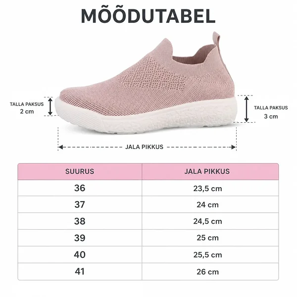 Pastelses toonis vabaajajalatsid on täiuslik segu mugavusest ja kaasaegsest stiilist. Tänu oma sokk-tüüpi disainile ja elastsele materjalile istuvad need jalas nagu valatult, olles ideaalsed kaaslased nii pikkadeks jalutuskäikudeks kui ka kiireteks toimetusteks linnas.