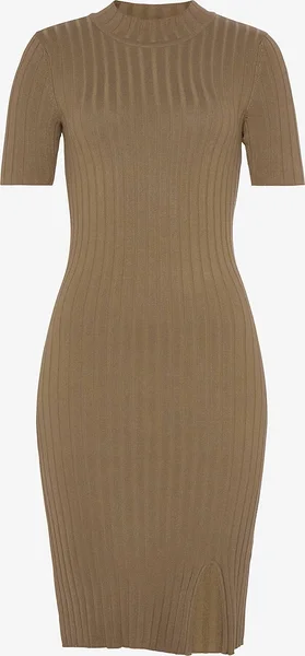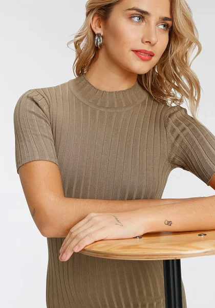 Naiselik, figuuri rõhutav soonikkleit, mis sobib suurepäraselt nii igapäevaseks kandmiseks kui ka viisakamateks hetkedeks. Pehme ja elastne materjal tagab mugavuse ning klassikaline lõige loob ajatu ja naiseliku silueti. Lühikesed varrukad ja kõrge kaelus annavad kleidile modernse ilme.