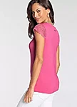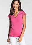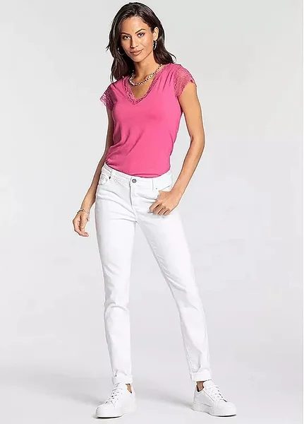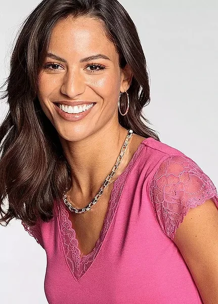Naiselik ja mugav lühikeste varrukatega pluus, mida kaunistavad õrnad pitsdetailid varrukatel ja V-kaelusel. Pehme materjal ning klassikaline lõige muudavad selle ideaalseks valikuks nii igapäevaseks kandmiseks kui ka veidi pidulikuma komplekti juurde. Pluus on kehasse ja keskmisest pisut pikema lõikega.