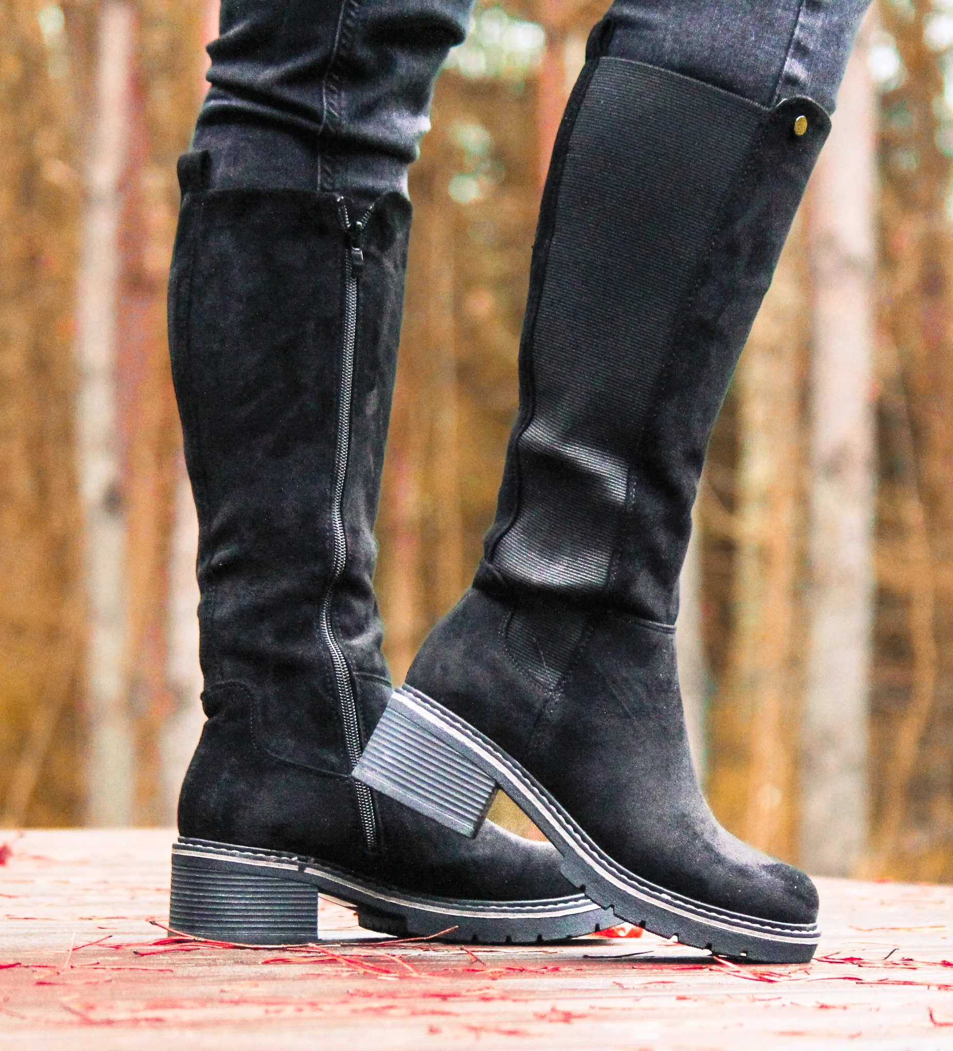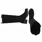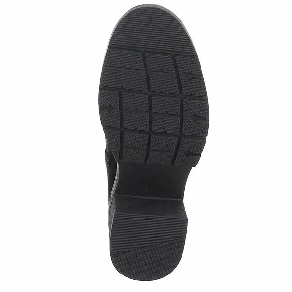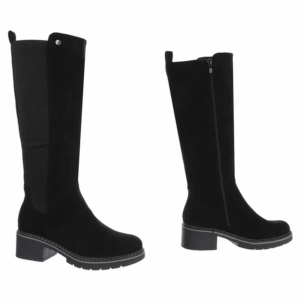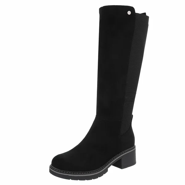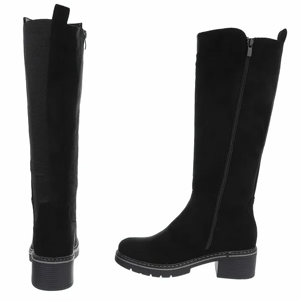 Trendikad mustad pikasäärega saapad igapäevaseks kandmiseks. Mugav 5 cm konts, siseküljel tõmblukk ning välisküljel elastne kummipaneel, mis tagab parema sobivuse. Vastupidav, väikese mustriga kummitald pakub head haaret. Sobivad keskmise laiusega jalale. Pealispind tekstiilist, meenutab seemisnahka.