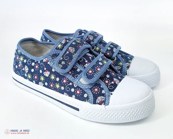 Laste vabaajajalatsid armsa lillelise teksariidest pealispinnaga. Tugev kummitald, krõpskinnitused ja mugav sisemus teevad need jalanõud igapäevaseks lemmikuks. Ideaalne valik kevadeks ja suveks.