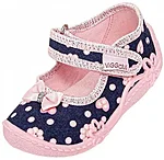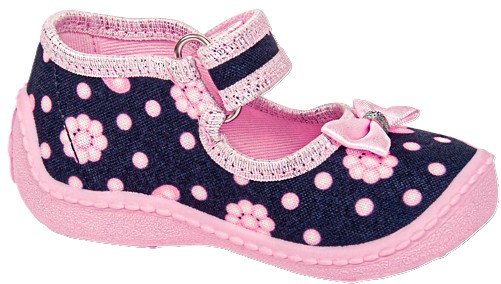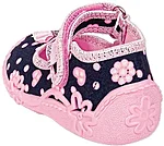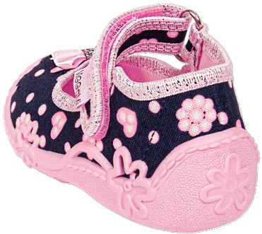 Armsad tumesinised tüdrukute kingad roosade lillede ja täppidega. Mugavad, pehmed ja kerged jalas – ideaalsed igapäevaseks kandmiseks või lasteaeda. Krõpskinnitusega rihm teeb jalatsite jalga panemise lihtsaks ning painduv kummitald tagab mugavuse.