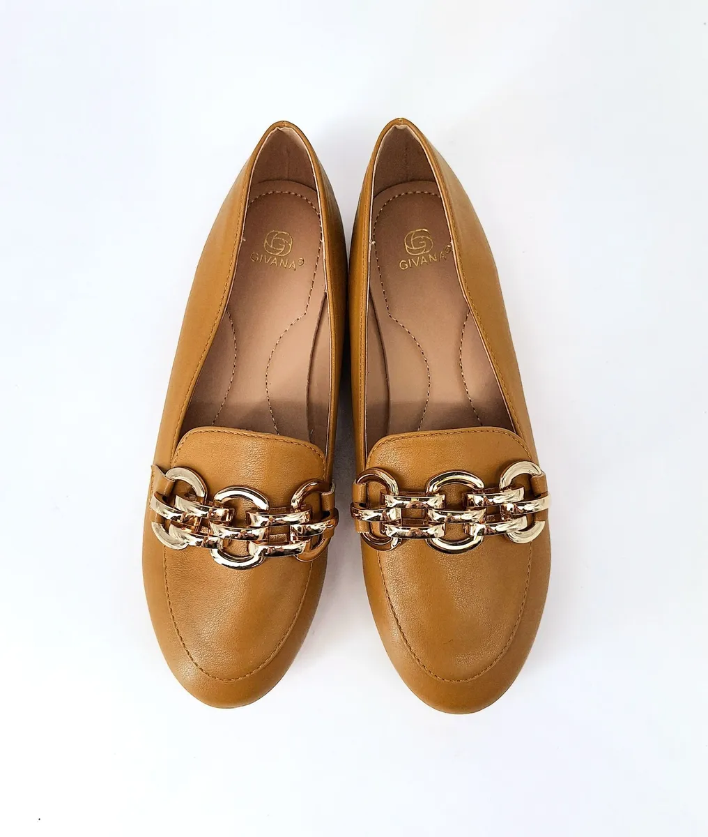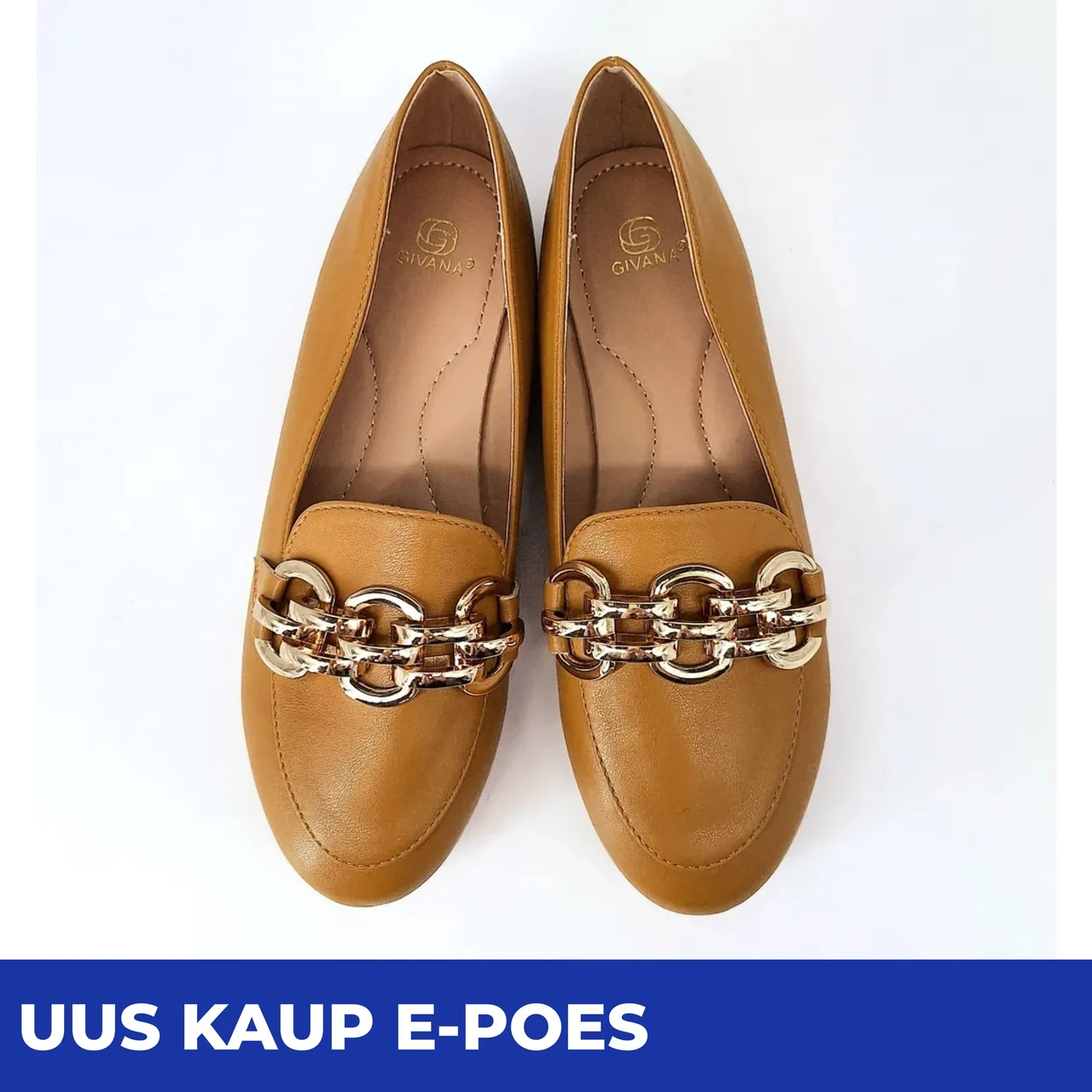Stiilsed pruunid baleriinad naistele, mille kinganina kaunistab silmapaistev kuldne ketidetail. Madala tallaga painduv kummitald tagab mugava kandmise igapäevastes olukordades. Ideaalne valik, kui soovid lisada oma garderoobi midagi naiselikku, kuid samas praktilist.