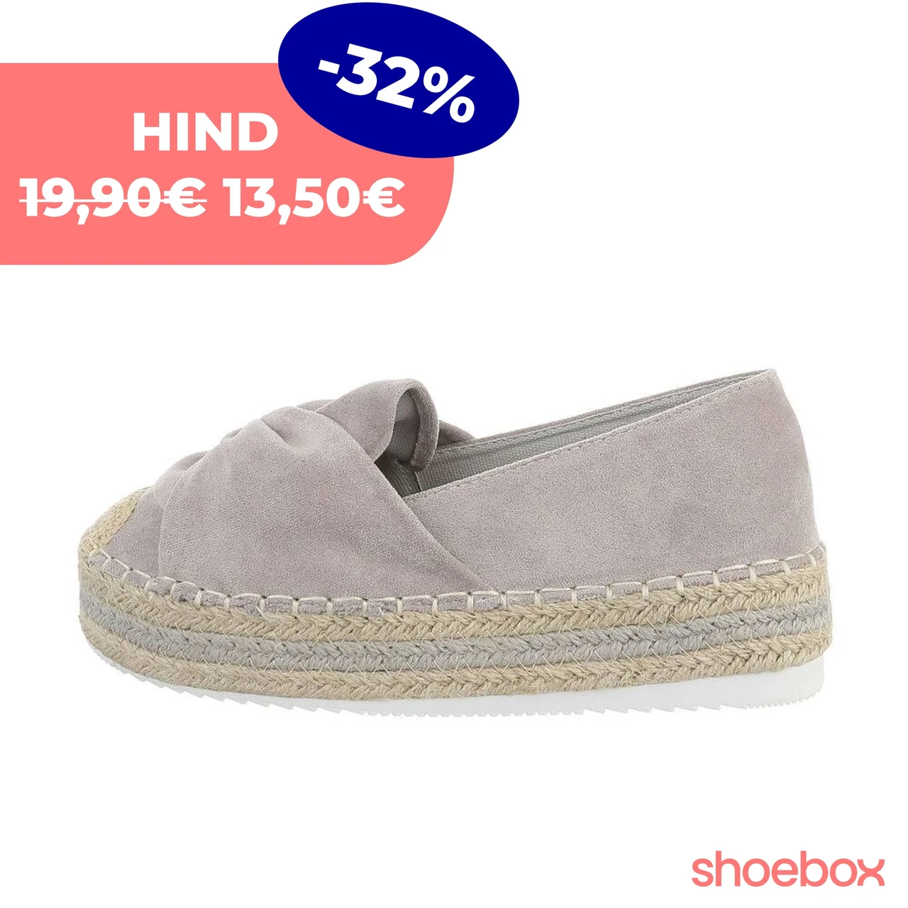 Trendikad platvorm-espadrillid, mis ühendavad suvise kerguse ja mugava kõrguse. Pehme seemisnahaimitatsioon helehallis toonis ja sõlmekujuline detail esiküljel loovad armsa ja moodsalt vaba stiili. Punutud platvormtald ja kummine välistald pakuvad stabiilsust ning head haardumist.