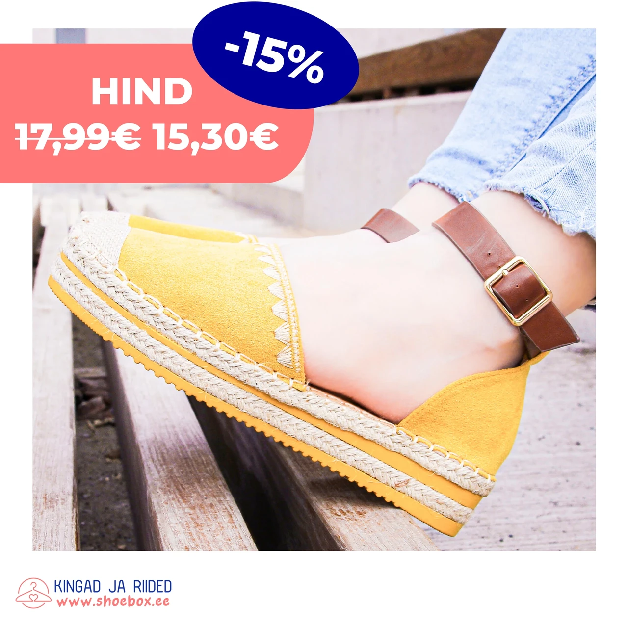 Stiilsed ja suvise hõnguga kollased espadrillid! Mugav platvormtald, reguleeritav nahkne rihm ja hingav tekstiilvooder tagavad maksimaalse kandmismugavuse. Ideaalne valik nii linna kui ka rannapuhkuseks.