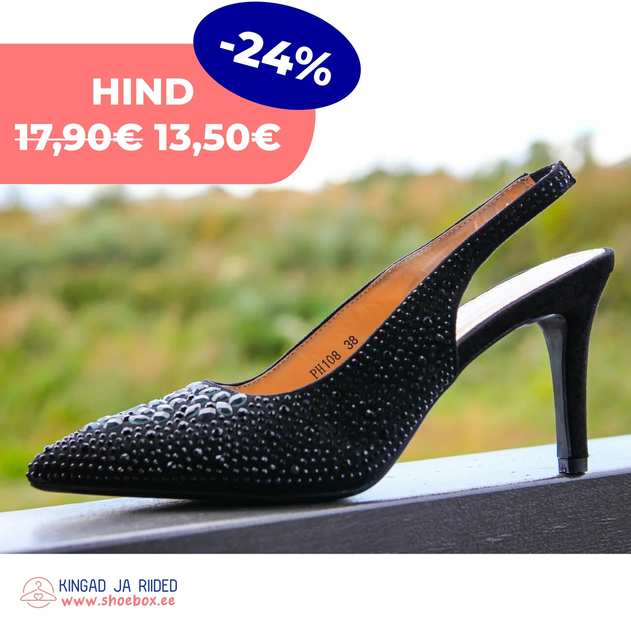 Elegantse disainiga mustad slingback kontsakingad sädelevate kivikestega. Terava ninaga ja keskmise kontsaga kingad sobivad ideaalselt nii pidulikeks sündmusteks kui ka stiilseks igapäevaseks kandmiseks. Avatud kannaosa tagab lisamugavuse ja trendika ilme.