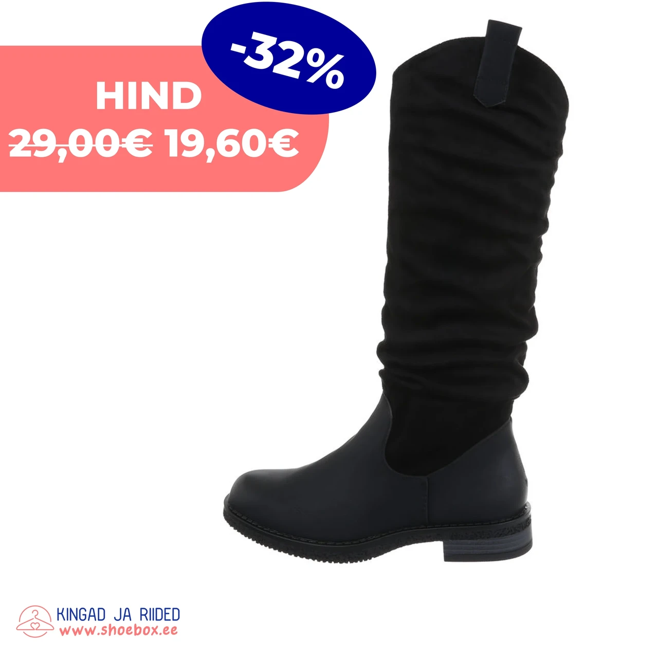 Stiilsed mustad saapad naistele, mis ühendavad klassikalise nahkse alumise osa ja pehme, kortsulise tekstiilist sääreosa. Madal konts ja kummist tald tagavad hea haarduvuse ning mugavuse ka pikemal kandmisel. Lukuga külgkinnitus teeb jalanõude jalga panemise lihtsaks. Ideaalne valik sügis- ja talvehooajaks igapäevaseks kandmiseks.
