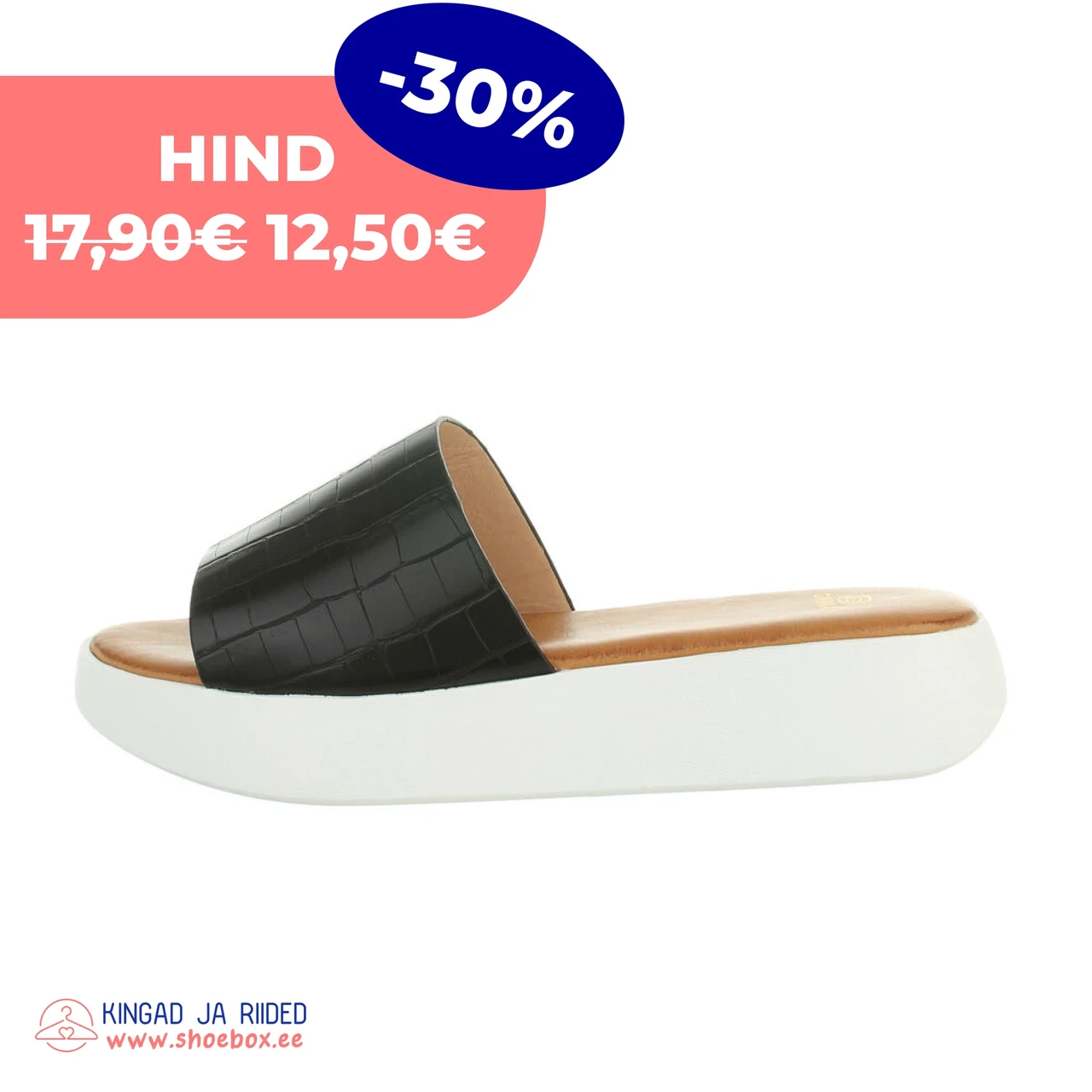 Stiilsed ja mugavad mustad plätud, millel on krokoefektiga viimistlus ja paks valge tald. Praktiline valik suveks, sobivad ideaalselt igapäevaseks kandmiseks.