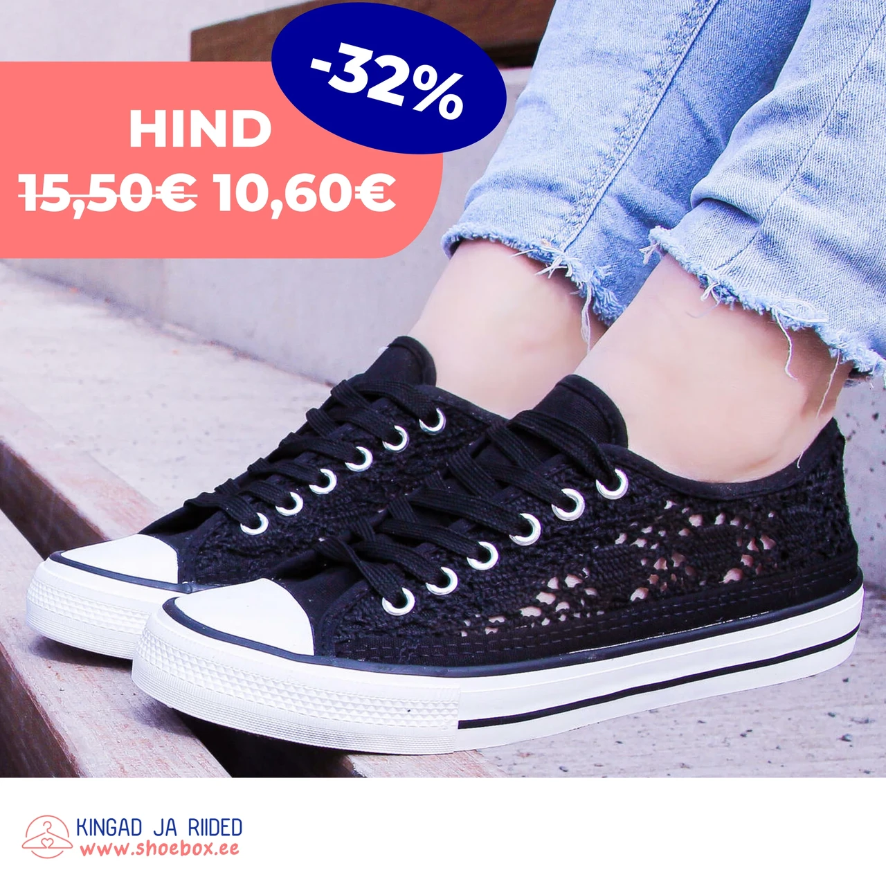 Stiilsed musta värvi heegeldatud tennised, mis ühendavad sportliku mugavuse ja naiseliku elegantsi. Hingav pealispind, klassikaline paelkinnitus ja kummitallad tagavad maksimaalse kandmismugavuse kogu päeva vältel. Ideaalne valik soojadeks suvepäevadeks!