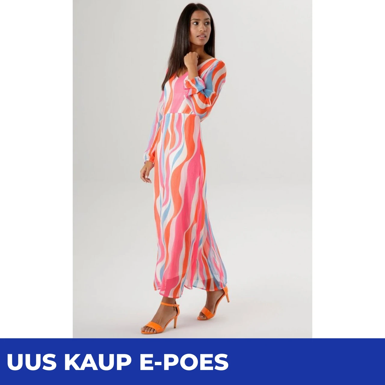 Värviküllane Aniston maksikleit on valmistatud kergest šifoonkangast, mis loob lendleva ja naiseliku silueti. Pikad varrukad ja mänguline lainemuster lisavad karakterit, samas kui sisemine vooder tagab kandmismugavuse. Täiuslik valik suvisteks üritusteks või puhkuseks.