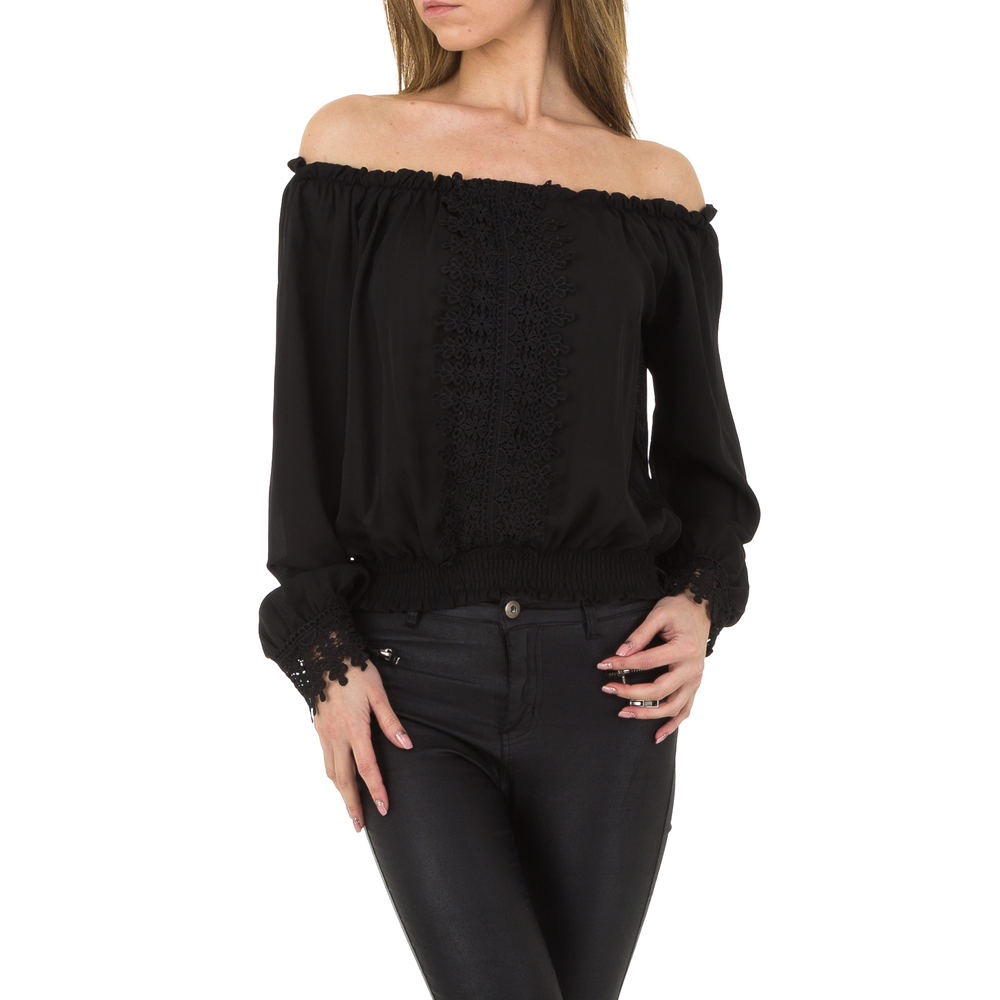 Naiselik must pluus paljastatud õlgadega. Elastne kaelus ja alläär tagavad mugava ja keha järgiva istuvuse. Rikkalik pitsdetail esiküljel ja varrukaotstes lisab elegantsi. Sobib ideaalselt nii igapäevaseks kandmiseks kui ka õhtuseks väljaminekuks. Saadavus: Laos